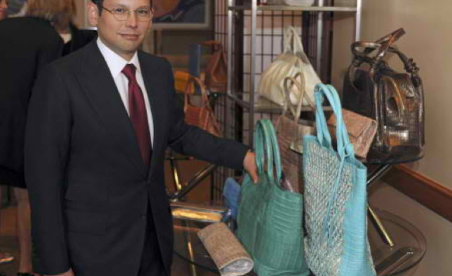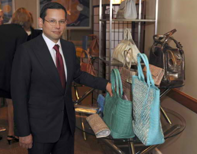 Santiago Gonzalez shows the recent Nancy Gonzalez handbag collection during a breakfast and fashion show at Neiman Marcus in Northbrook. The kick off event was held for Loyola Academy’s annual “Ramble,” a fundraiser. | Brian O’Mahoney~Sun-Times Media
